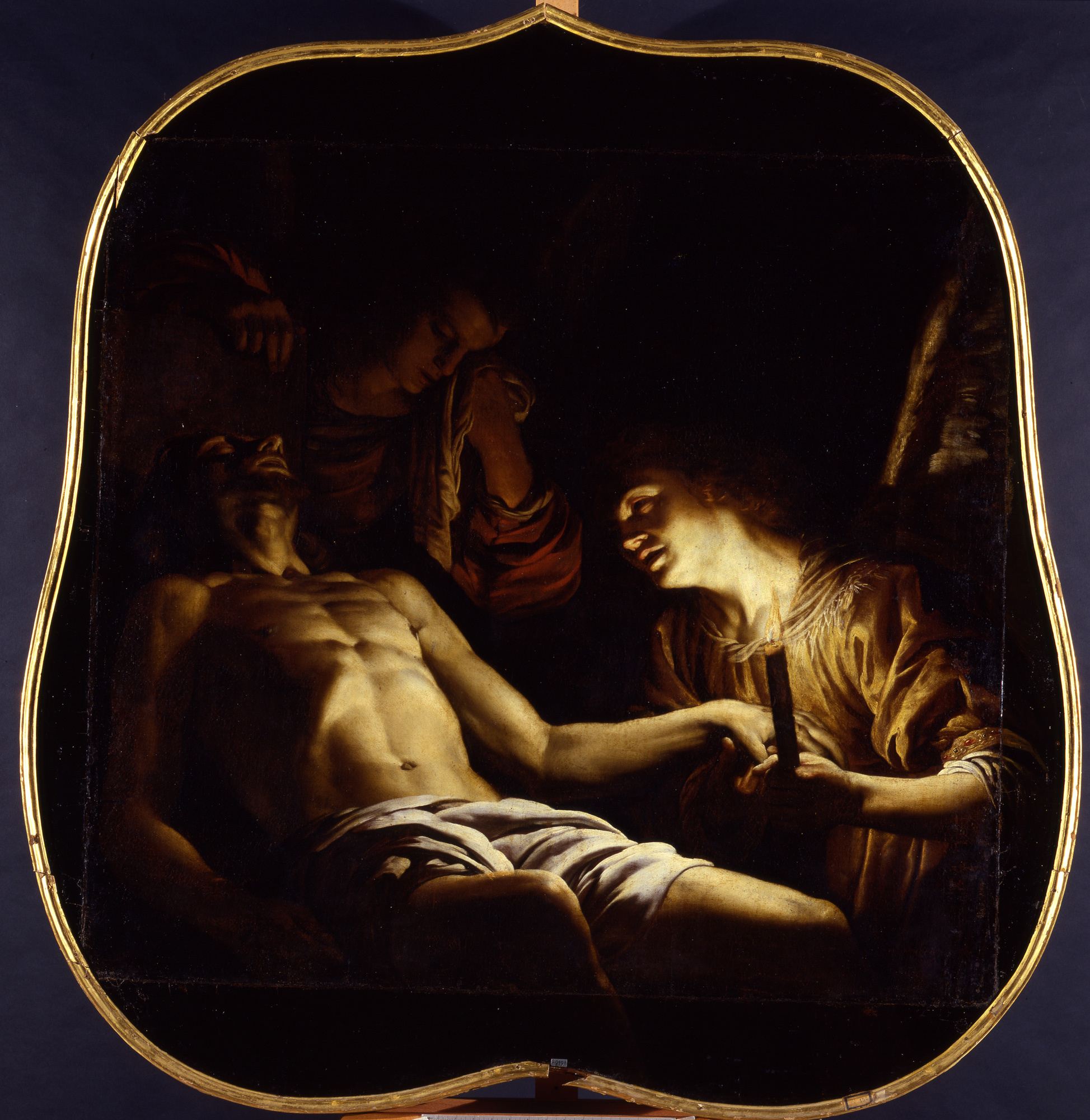 L’inconsueto soggetto del Cristo pianto dagli angeli, sebbene non compaia nei testi biblici, rientra nella tradizione devozionale della Pietà. In genere gli angeli sono due e sostengono il corpo di Gesù, presentandolo all’osservatore, oppure, come in questo caso, lo lasciano al centro della composizione piangendolo accoratamente. La scena è notturna, il luogo è il sepolcro del Nazareno. Il lume della candela domina qui tutta la composizione, colpendo con vigore il collo e il petto dell’angelo di destra e scorrendo più tenue sull’addome di Gesù, sfumando e insieme riscaldandosi nei fondi, con resa naturale sia dei particolari anatomici, sia del panneggio in primo piano. Il dipinto manifesta segni inconfondibili dello stile di Gerrit von Honthorst, che all’inizio della sua carriera visitò Roma, dove conobbe le opere dei maestri italiani e specialmente quelle del Caravaggio.